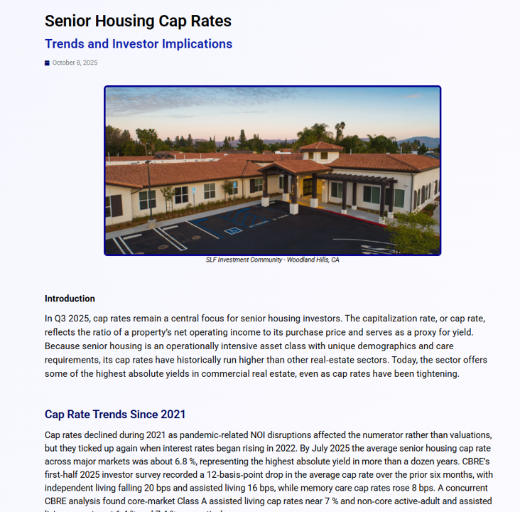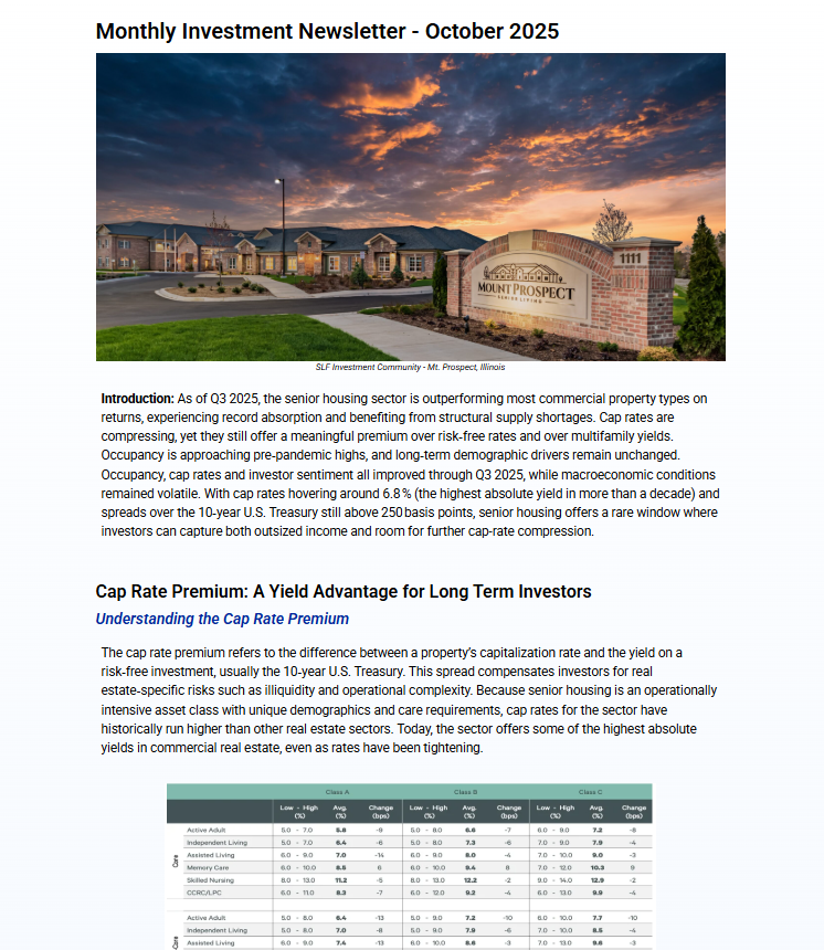 Investing with Senior Living Fund not only provides you the opportunity for predictable passive above-market returns. Just as importantly, you will be a part of a community making a positive impact in supporting our elders in the golden years of their life’s journeys, while assisting heroic caregivers in communities around the nation. Join Us!