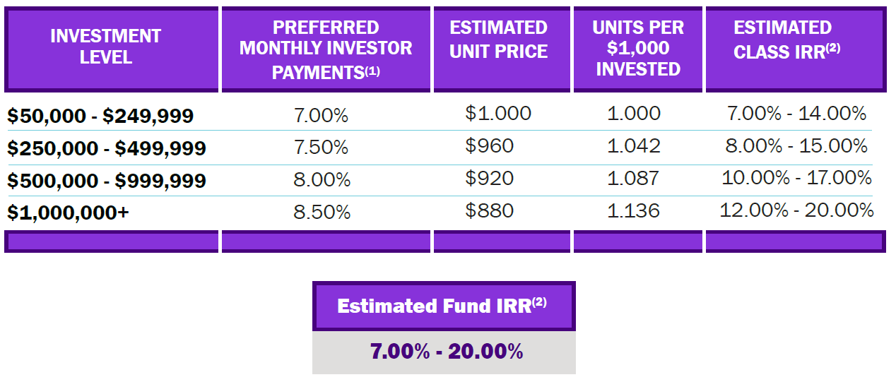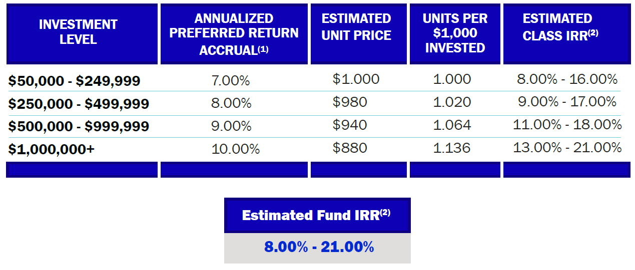 SLF Value-Add Fund 2 offers multiple levels of participation for accredited investors. With each increasing level of investment participation, investors will accrue a higher annualized preferred return rate, as well as receive reduced unit pricing. Overall, resulting in a higher estimated IRR per increasing investment class, as outlined in the below table: